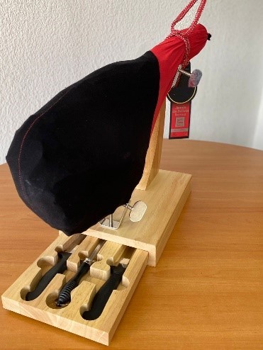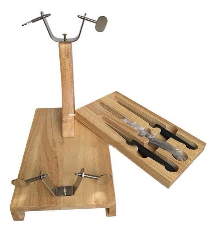 La base para pierna es firme e incluye juego de cuchillos y afilador